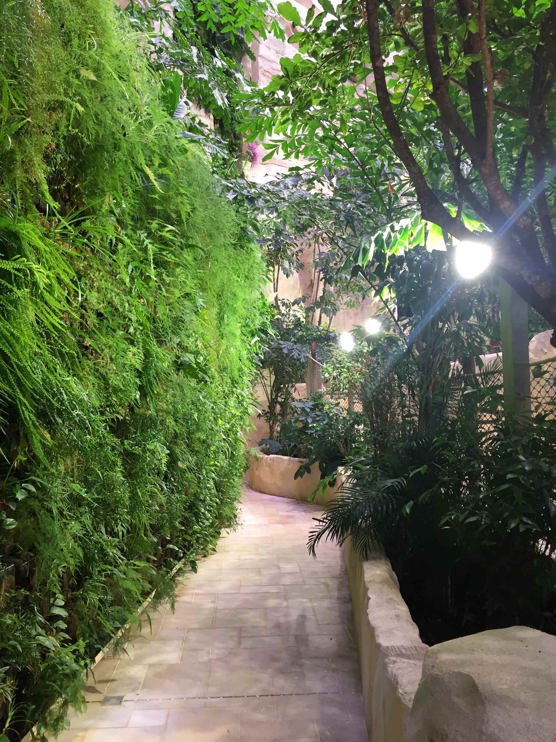 We’ve iluminated this huge indoor jungle in a swimming pool area with very powerful lamps that float above the trees and plants at a great height. Maximum result with a minimum number of lamps!